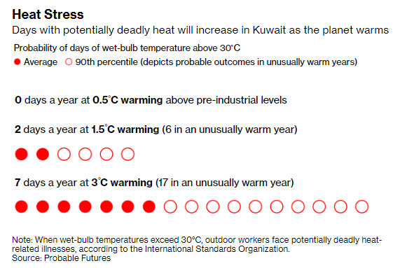 即便全世界迅速減少了排放,足以避免災難性的全球變暖,各國也將不得不適應更極端的天氣。專家們認為,從目前的情況看,科威特的計劃還遠不足以使其成為宜居國家。