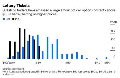 看漲油價的投資者積累了大量執行價格高於每桶90美元的看漲期權合約,押注油價走高。