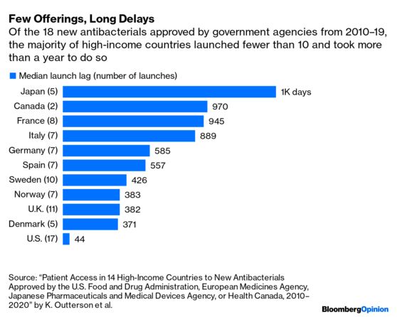 到2020年這十年間,獲得美國食品藥品監督管理局(FDA)批准的15種新抗生素中,有五種因公司申請破產而生產被擱置或被出售。研究人員去年指出,2010年至2020年期間有18種抗生素藥物在七國集團(G7)和其他高收入歐洲國家獲得批准並上市,但大多數只能在英國、美國和瑞典這三個國家可以買到。在一種抗生素藥物上市之前,通常還會有長時間的延誤。