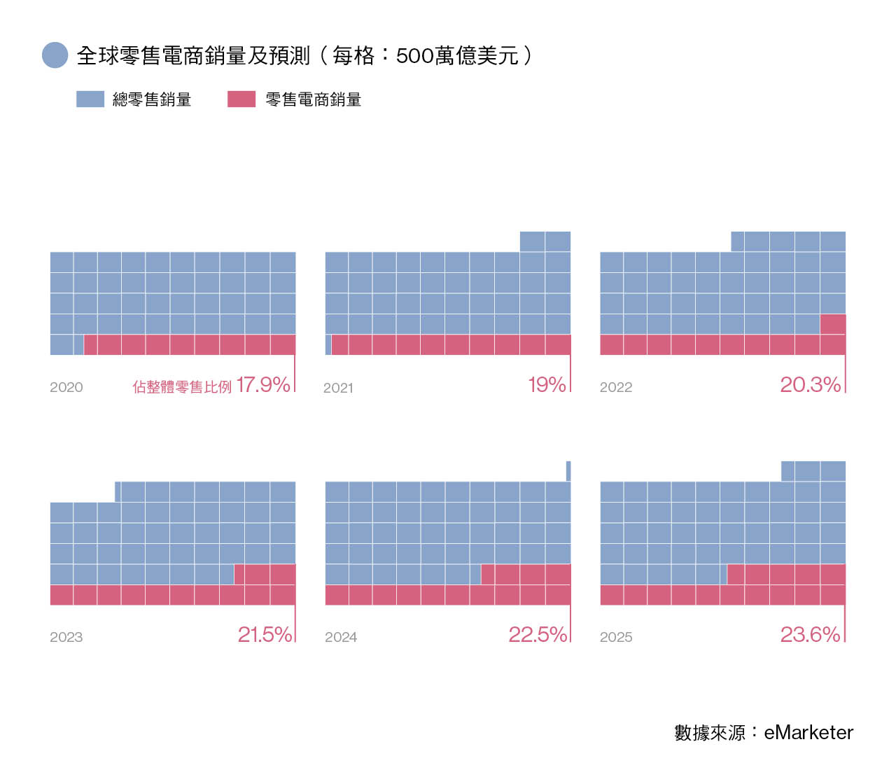 新冠疫情徹底改變了全球大小經濟體的消費模式,各國反覆的封鎖和禁足將消費者困在家中,無論是想獲得必要的生活用品還是尋找解悶的玩具和遊戲機,全都只能依靠網購。以電商市場發展已相當成熟的美國為例,電商銷量在疫情開始後的三個月已達到過去10年總和的水平。市場研究機構eMarketer的數據顯示估計,全球電商銷售額由2019年的3351億美元躍升至2020年的4248億美元,更有可能會在2024年之前達到近6.4億美元 ,佔整體零售額的五分之一。