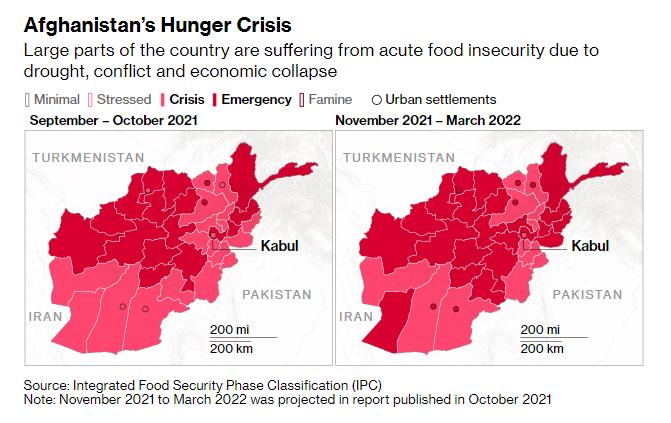 阿富汗的飢餓危機:由於乾旱、衝突和經濟崩潰,阿富汗大部分地區出現了嚴重的糧食不足 (輕微/嚴重/危機/緊急/饑荒;圓點為城市居民區;2021年9月至10月/2021年11月至2022年3月)(資料來源:糧食安全階段綜合分類(IPC))(註:2021年11月至2022年3月的情況為2021年10月報告中的預期)