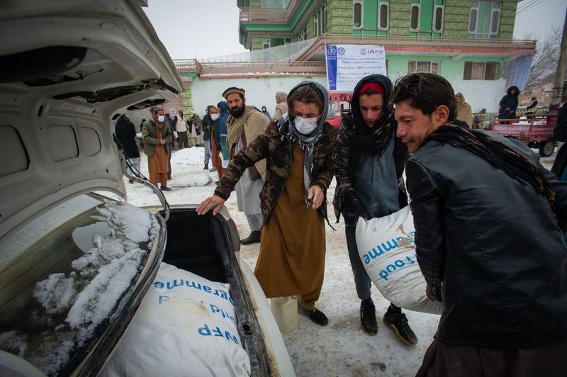 1月,聯合國世界糧食計畫署向喀布爾南部400個家庭分發糧食配給時,成袋的麵粉裝車待運。