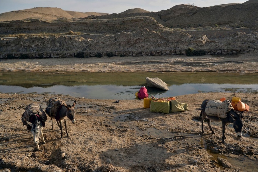 2021年10月,阿富汗巴德吉斯省Bala Murghab區,一名男子用水桶取水。