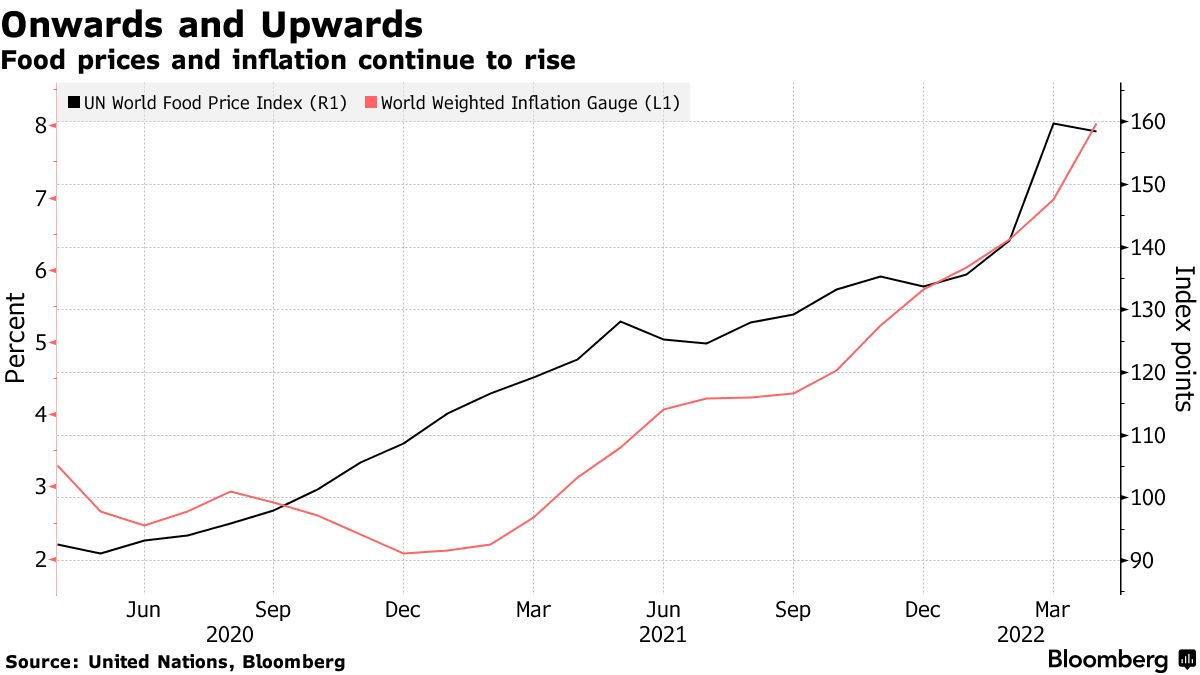 聯合國的一項食品價格指標自2020年年中已累計上漲超過70%,而在俄烏戰爭阻礙農產品出口、打亂供應鏈後,該指數已接近紀錄高點。食品保護主義潮或推高成本,進一步打擊消費者購買力,並讓試圖在保增長同時控制通脹的央行面臨難題。