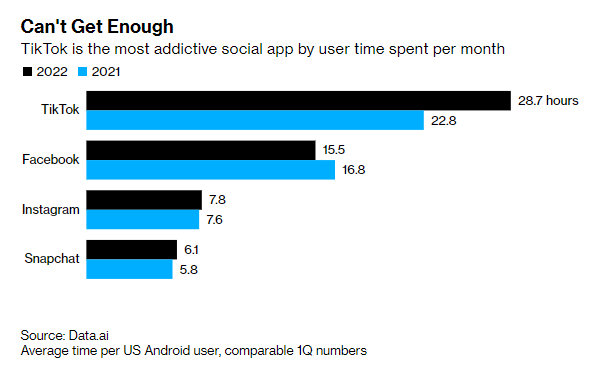 TikTok的每月活躍用戶為10億,仍然少於Facebook(29億)和同樣在Meta旗下的Instagram(20億)。然而,事實證明TikTok的內容非常吸引:移動數據分析公司Data.ai的數據顯示,目前TikTok的美國用戶平均每月的使用時間約為29小時,超過了Facebook(16小時)與Instagram(8小時)的總和。美國紐約大學斯特恩商學院的教授加洛韋(Scott Galloway)比喻人們的上癮程度為鴉片。