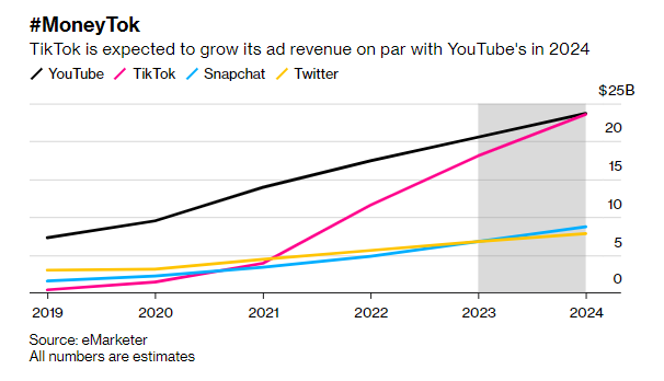 #賺錢Tok:預計到2024年,TikTok的廣告收入將與YouTube持平(數據來源:eMarketer)*所有數據均為估值