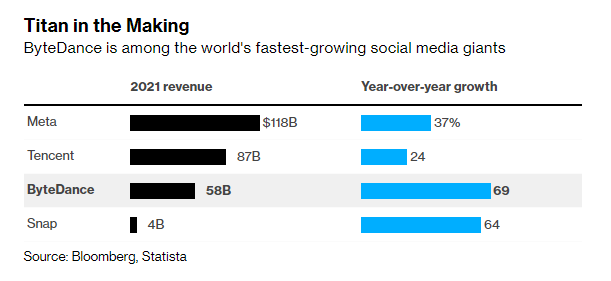 字節跳動是全球發展最快的社交媒體巨頭之一:2021年收入、較上年增幅(資料來源:彭博、Statista)