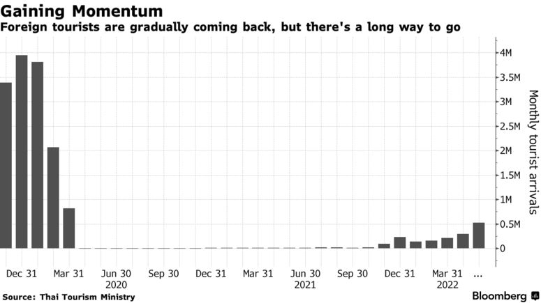 泰國預計今年入境的遊客可達930萬人次,而2021年僅約42.8萬人次。相比2019年泰國接待的4000萬境外旅客,該數字仍差距甚大。世界銀行在6月29日發表報告,預計到2024年泰國入境人數將達到2400萬,相當於疫情前的60%。