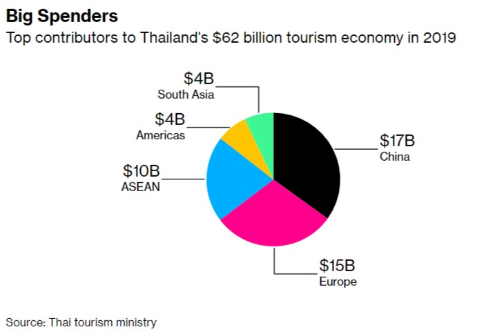2019年對泰國620億美元旅遊經濟貢獻最大的遊客:南亞 40億;美洲 40億;東盟 100億;歐洲 150億;中國 170億(數據來源:泰國國家旅遊局)
