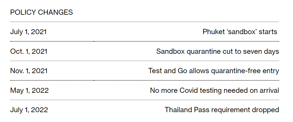 政策變化:2021年7月1日 布吉島「沙盒計劃」正式啟動:2021年10月1日 沙盒隔離時間縮短至7天;2021年11月1日 允許「即測即走」免隔離入境;2022年5月1日 入境不再需要核酸檢測;2022年7月1日 取消「泰國通行證」