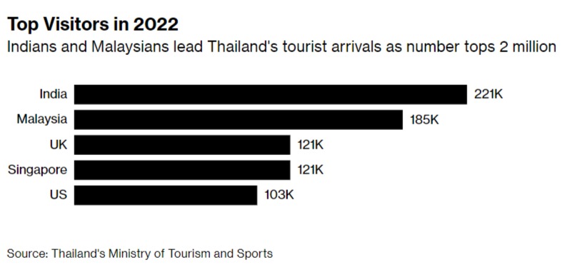 2022年,泰國入境遊客人數超過200萬,印度和馬來西亞名列前茅。印度 22.1萬;馬來西亞 18.5萬;英國 12.1萬;新加坡 12.1萬;美國 10.3萬(數據來源:泰國旅遊和體育部)