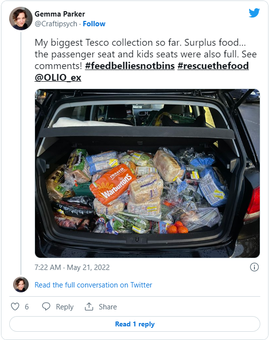 「這是我在Tesco迄今最豐富的收穫。過剩的食物...... 副駕駛和兒童座椅也放滿了。看看評論!」