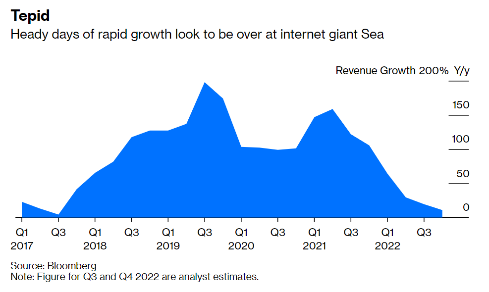 表現乏力──對互聯網巨頭Sea來說,快速增長的好日子似乎即將告終。(數據來源:彭博新聞社)*注:2022年第三和第四季度數據為分析師預估值。