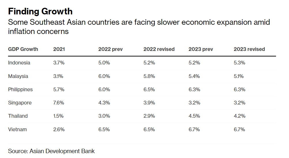 新加坡本月稍早將GDP預期增速下調1個百分點,而亞洲第六大經濟體臺灣將今年的增速預期下調2個百分點,理由是電子消費品需求放緩和私人消費下跌。 亞洲開發銀行還下調了泰國和馬來西亞2022年和2023年的GDP增速預期。