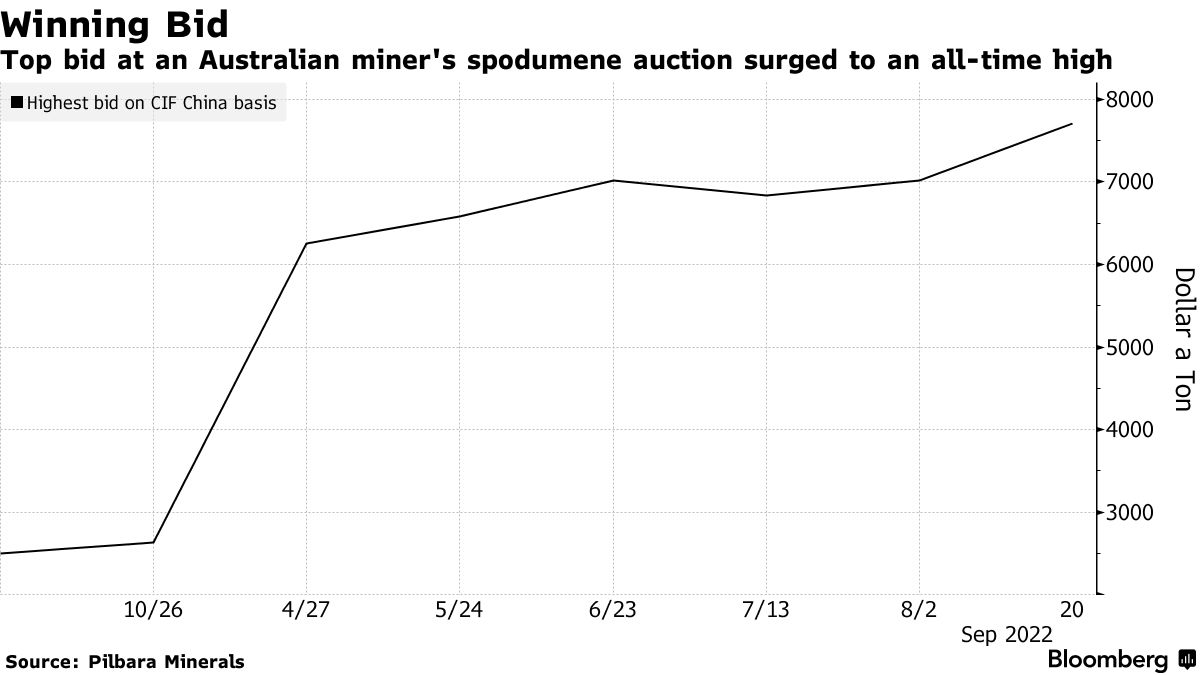 Pilbara稱,一買家將支付相當於每噸7708美元的價格競得交付中國的鋰輝石精礦。這批5000噸鋰輝石精礦的拍賣價格高於8月初上一次拍賣成交價每噸7012美元。