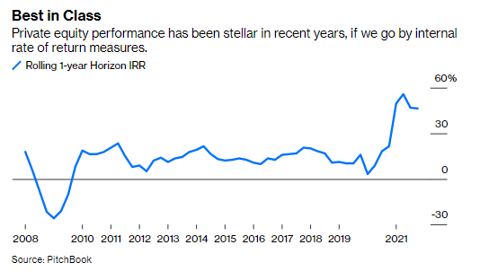 若以內部收益率指標衡量,私募股權基金近年來的表現一直非常出色。 (來源:PitchBook)
