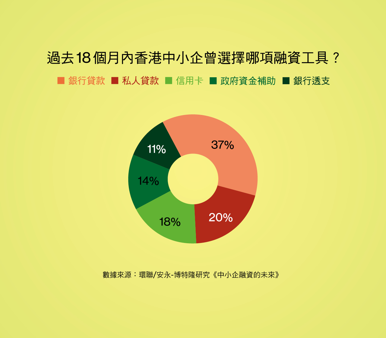 對於疫情下急需現金周轉的中小企而言,首選的資金來源其實是香港政府推出的「百分百擔保特惠貸款計劃」。該計劃由政府全數擔保,提供較優惠的利率,每間合資格企業的最高貸款額為27個月的僱員薪金及租金開支的總和,上限900萬港元。然而,FundFluent創辦人及行政總裁歐詠曦表示,部分香港中小企的東主與公司共用同一個銀行帳戶,無法證明自己正在營運一盤生意,或者通過有組織的方式發放薪金給員工,因此根本無法獲得這類型的政府貸款。上述的《中小企融資的未來》報告亦提及,雖然銀行貸款仍然是最受中小企歡迎的信貸產品,但有兩成受訪中小企曾選擇透過私人貸款獲得資金。