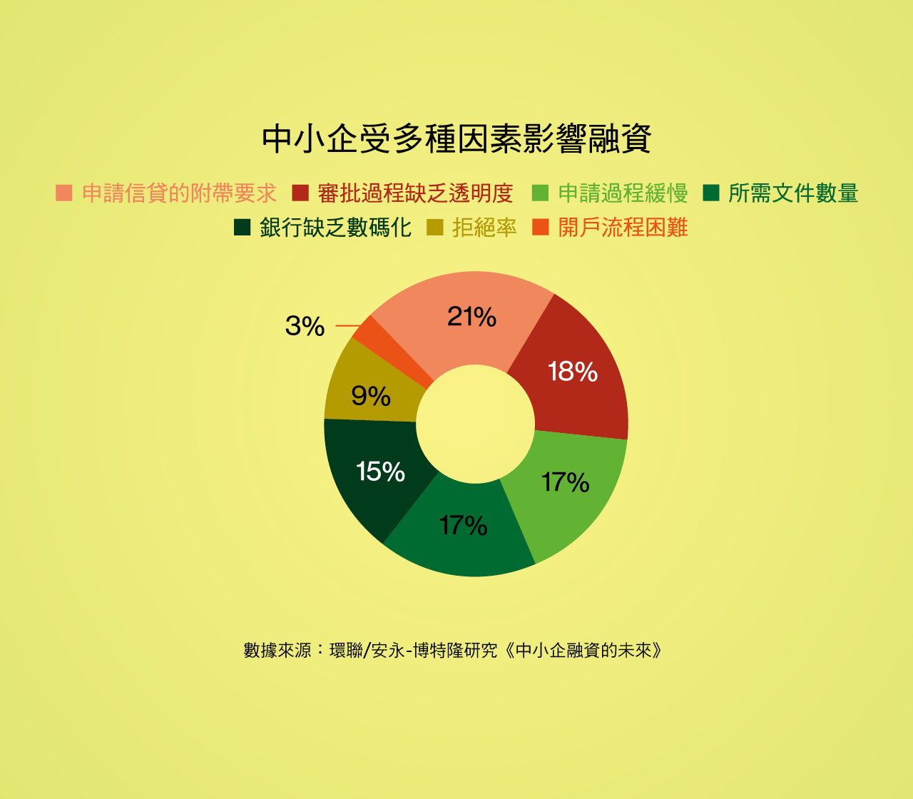 「商業數據通」為香港金融管理局的「金融科技2025」策略之一,目的是推動金融機構從公私營數據提供方獲得企業,尤其是中小型企業的商業數據,簡化信貸評估、貸款批核等融資流程。流程過於繁複以及缺乏數據正正是中小企信貸面對的兩大難題,根據環聯及安永-博智隆發布的《中小企融資的未來》報告,超過七成中小企表示,繁複冗長的申請流程是融資過程的主要痛點。接受調查訪問的業內人士則表示,處理中小企貸款申請時,最大的障礙包括缺乏特定中小企數據作風險評估,以及欠缺針對中小企信貸而設的風險評估工具。