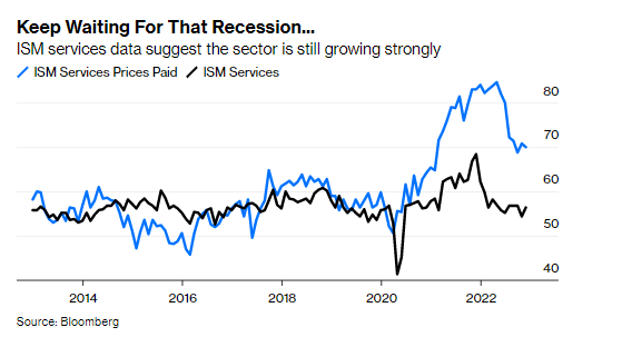 繼續等待衰退到來...... ISM數據顯示美國服務業仍在強勁增長:ISM服務業支付價格指數、ISM服務業指數(來源:彭博)