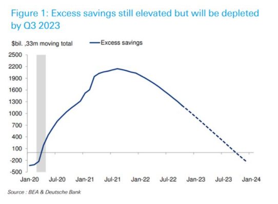對此,我們不應感到意外。從大量資金的角度審視經濟──下圖來自德意志銀行,揭示了美國人在疫情、以及隨後政府刺激支出期間,積累了大量超額儲蓄。這些儲蓄現在正逐步減少。但按當前速度,在明年下半年之前,美國人至少仍會有一些超額儲蓄。