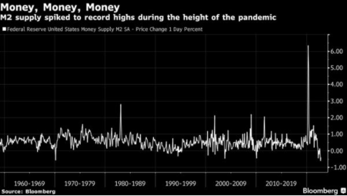 貨幣、貨幣、貨幣──在疫情最嚴重時期,M2供應量飆升,並創下歷史高點(來源:彭博)