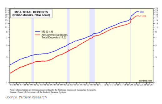 M2和存款總額(兆美元,等比量表);M2(21.4);全部商業銀行:存款總額(17.7)(來源:Yardeni Research)