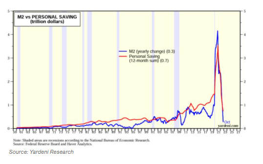 M2與個人儲蓄(兆美元);M2(年度變動)(0.3);個人儲蓄(12個月總和)(0.7) (來源:Yardeni Research)