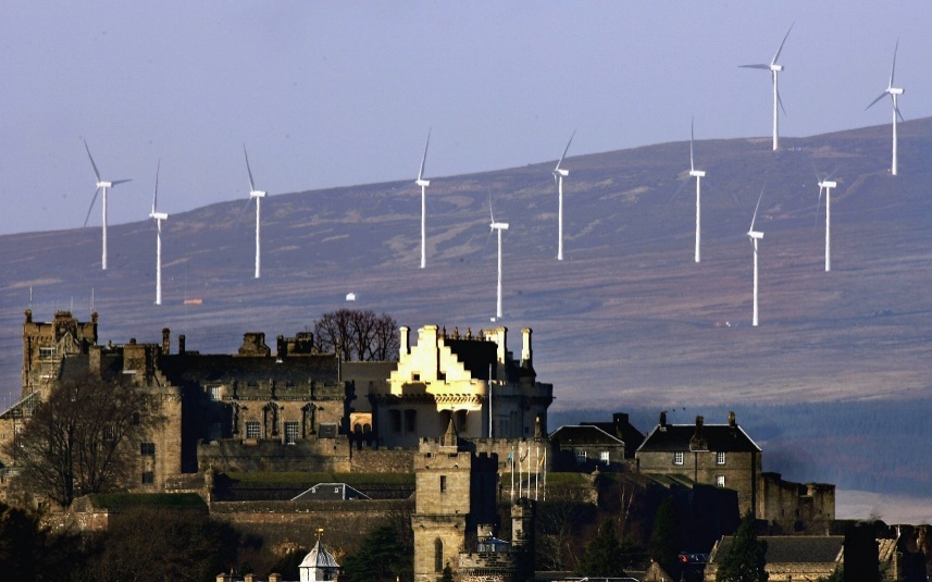 在蘇格蘭斯特靈城堡旁,可以看到風力發電機。(攝影:Jeff J Mitchell/Getty Images