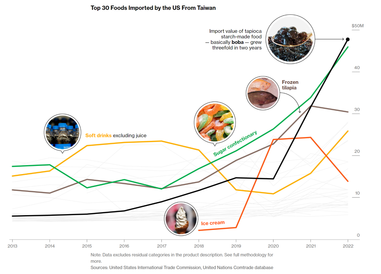 2022年,美國進口了約3050萬公斤木薯粉和澱粉製成的替代品──該商品類別是臺灣政府衡量奶茶珍珠出口的指標。美國國際貿易委員會(International Trade Commission)的數據顯示,按貨品價值計算,臺灣出口商佔據了69%的市場份額。