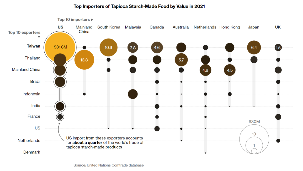彭博新聞社分析了聯合國最新貿易數據,在2021年,臺灣木薯粉食品出口額增長23%,突破了1億美元,是第二大出口國泰國的三倍。