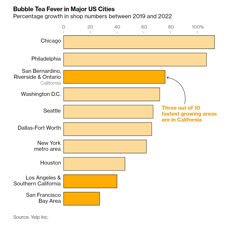 網上評論平台Yelp的數據顯示,2019至2022年,美國七個城市群(多數擁有較多亞裔人口且在不斷增長)的珍珠奶茶店數量增長了60%有餘。Yelp稱,芝加哥地區的增幅最大,其次是費城。