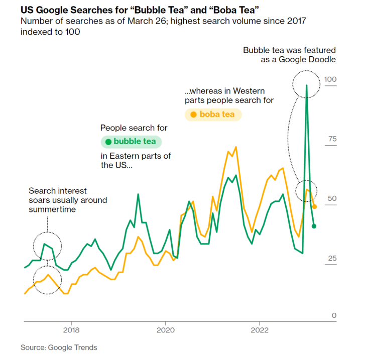 Google Trend的數據顯示,2021年,疫情限制措施放寬後,美國人對「珍珠奶茶」或「波霸奶茶」的興趣暴增。今年1月,這兩個關鍵詞的整體搜尋量創下了新紀錄──適逢Google為慶祝珍珠奶茶擁有自己的表情符號三周年,製作了一款塗鴉遊戲。