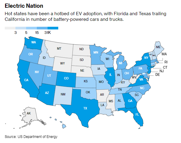 氣候炎熱的州電動汽車增量一直較多,佛羅里達和得州的電動汽車和電動卡車保有量低於加州。(來源:美國能源部)