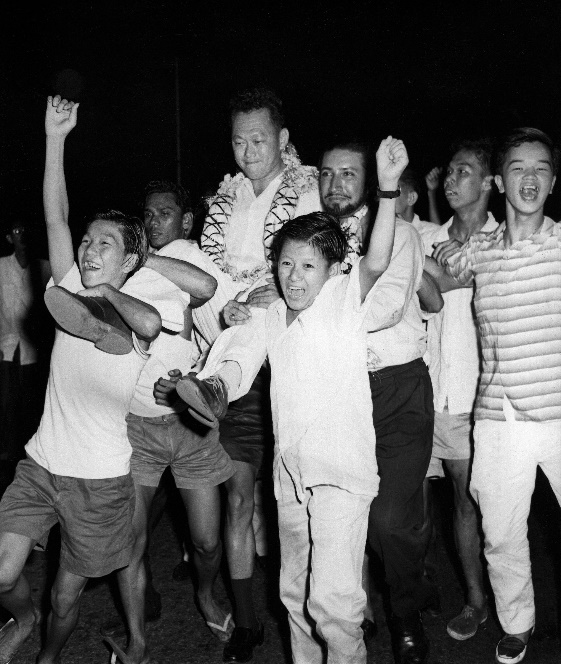 1959年,穿白衣的支持者慶祝李光耀勝選。(來源:彭博)