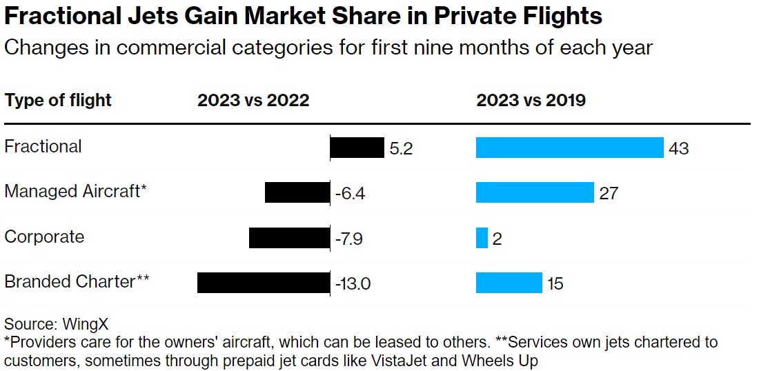 WingX資料顯示,以伯克希爾哈撒韋公司(Berkshire Hathaway Inc.)旗下的NetJets和Flexjet領銜的分割所有權航空領域今年前9個月的航班數增長了5.2%,而包機航班減少了6.4%。過去4年,分割所有權航班的增速也超過了包機和企業飛機。
