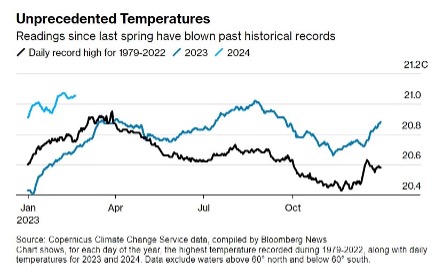 圖表顯示了1979-2022年期間記錄的每日最高氣溫,以及2023年和2024年的每日氣溫。資料不包括北緯60度以上和南緯60度以下的水域。
