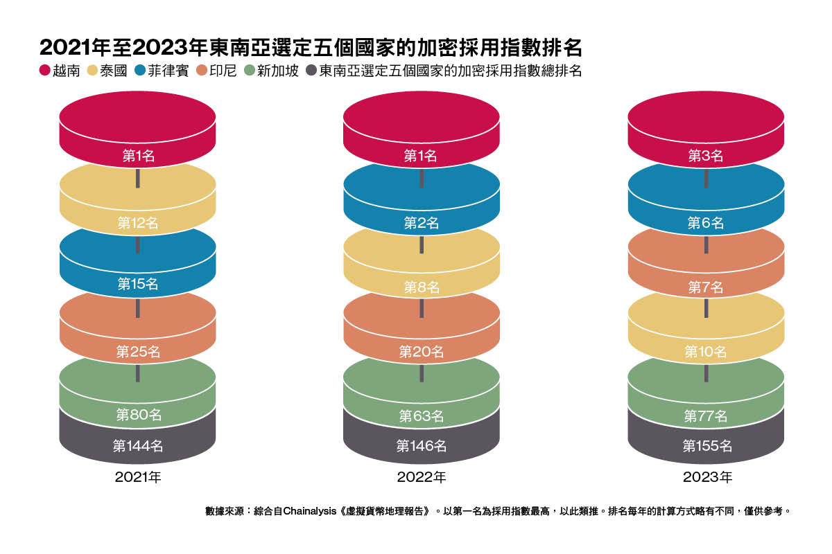 Xfers起家於支付、踏足虛幣交易所,最後回到支付的發展路徑,一方面與新加坡虛擬資產市場相契合。縱使虛幣行業在當地發展多年,但當地從來不是一個「虛幣大國」。根據Chainalysis過去三年的報告,新加坡過去三年在全球加密採用(Crypto Adoption)指數排名的百多個國家中位列居中(下圖),社會虛擬貨幣的滲透率和應用度遠遠落後於同區的印尼、菲律賓、越南和泰國。