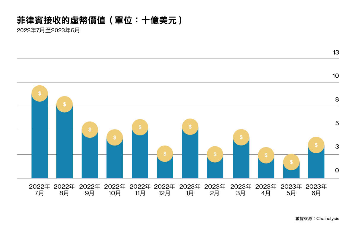 相較於新加坡,菲律賓對虛擬資產市場的監管步伐走得更快,虛幣的採用度同樣較高。Chainalysis的資料顯示,當地在過去三年裡,虛幣採用指數排名中位居前列;僅僅在2022年7月至2023年6月期間,菲律賓接收的虛幣價值達到750億美元。對此,Zhou提到虛擬資產正為當地帶來的「造富效應」。