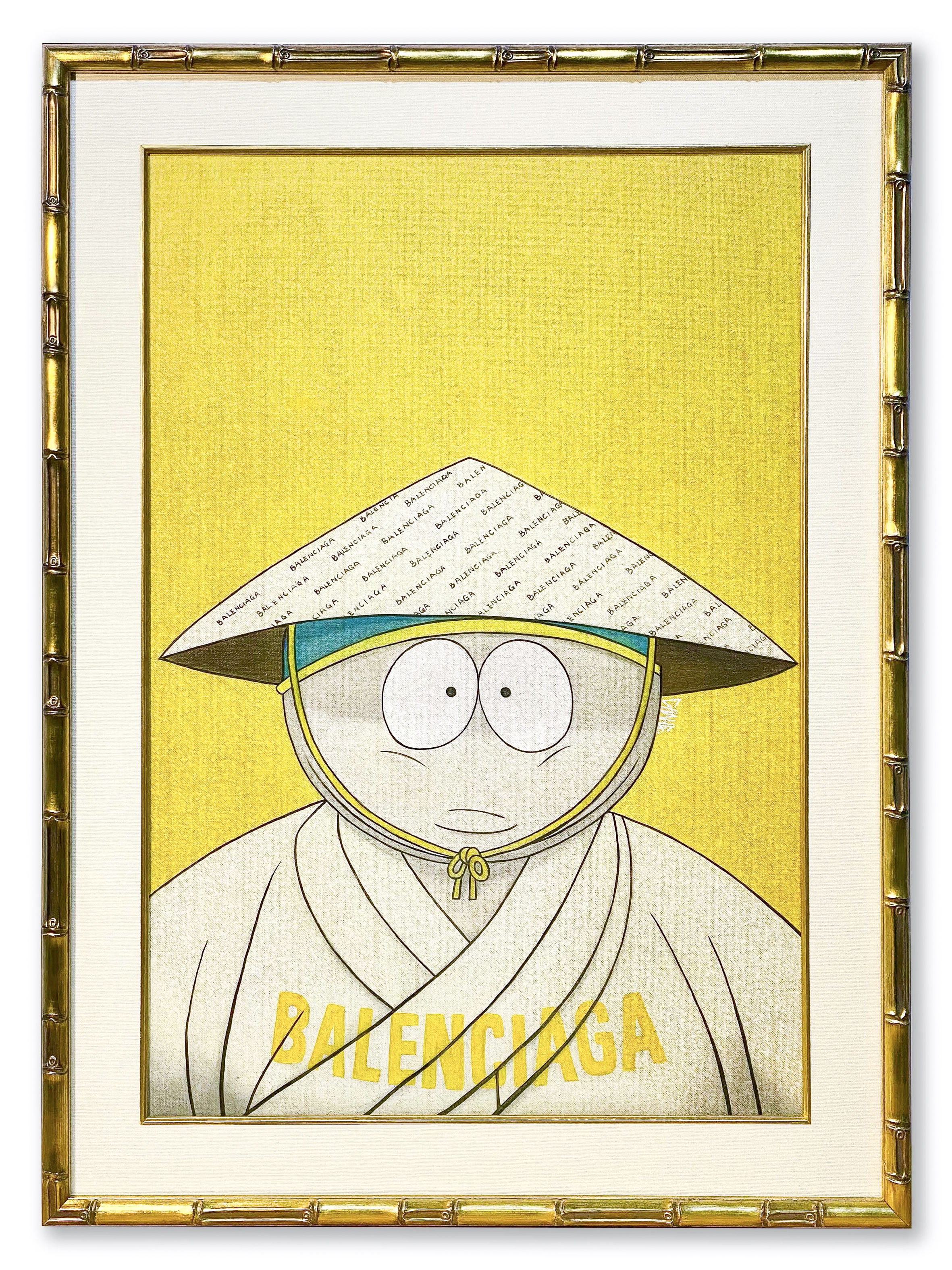 在他的創作中,很容易發現中西文化共存的影子。比如2021年的《閃閃皇朝》(Bling Dynasty)系列,張子言融合了現代的絲網印刷和傳統的刺繡、書法等技藝,還常常將西方動畫角色放入中國傳統的肖像構圖中。其中創作於2020年的《Don’t say anything mean》就讓諷刺動畫《南方公園》中的角色身著元代長衫、頭戴蓑笠狀的帽子。與此同時,長衫及帽子上又寫滿了奢侈品牌Balenciaga的名字。