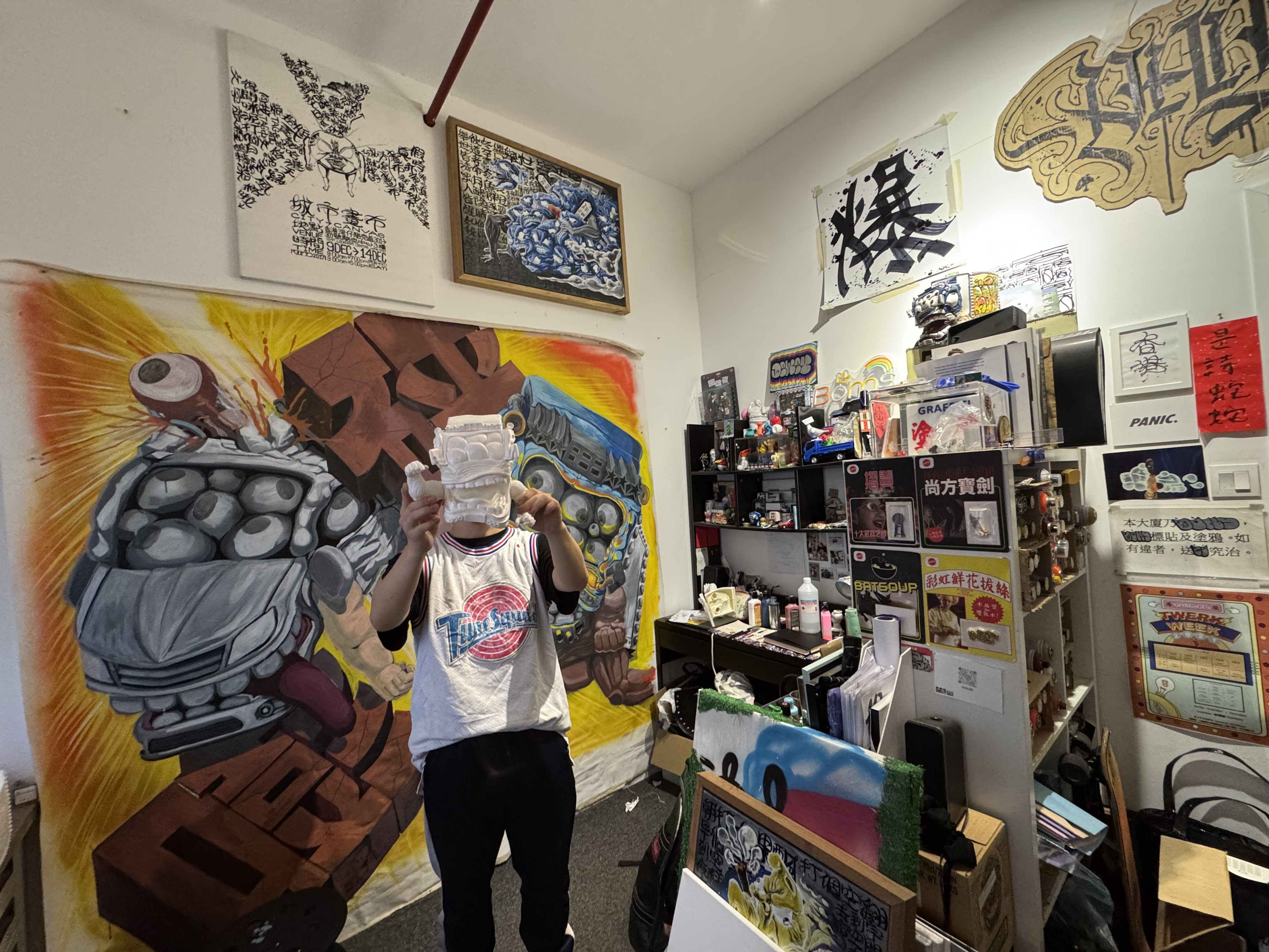 相較宏觀的數字,尋找一面空白的創作空間可能會令BOMS更加興奮。就在不久前,他也去了一趟佳士得——跟隨工程隊給一個拍賣會的場地刷油漆,這是他其中一份兼職工作。身兼數職既是生活常態,也是他觀察香港社會的途徑,正如他尊崇的香港藝術家程展緯的創作方式。後者長時間介入社區,經常化身各種基層角色,並擅長透過離奇可笑的幽默感質疑社會與政治問題。