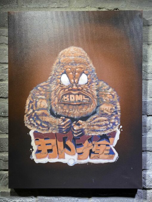 BOMS工作室的一扇矮門後有一個夾於兩棟高樓間的天台,四周擺放著創作用的木板和木梯。往下望就是紅磡繁忙的車道,不時有貨車喇叭聲傳來。他的創作靈感大多來自「小人物」的真實生活,比如曾從事的設計工作讓他飽受責罵,個人情緒無處發洩,他於是想像自己是一顆藍色炸彈。「這個社會總是基於『禮貌』,就算生氣也不會直接『噴』出去,」BOMS笑著說,「所以我就將憤怒『噴』在牆上。」在The Stallery的十周年展中,他選擇了一幅自己的代表作,即創作於2020年的《That Gorilla》(那猩)。這是在噴漆底稿上進行丙烯顏料創作的作品。巧妙的諧音既展現了塗鴉的「反主流」意識,也通過喚起對於粵語的聯想來彰顯本土性。