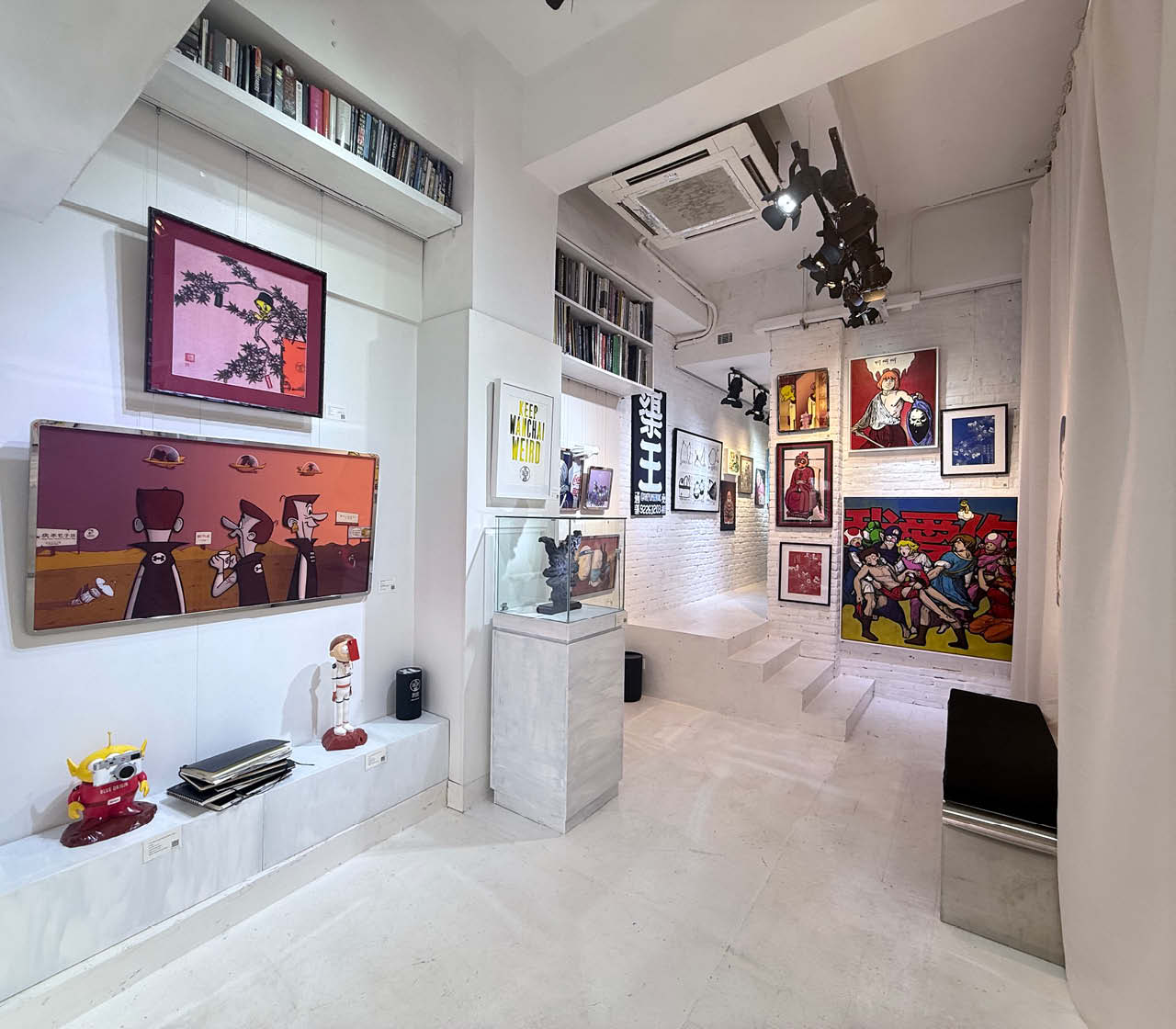 正如他所說,The Stallery的許多藝術家擅長流行或街頭藝術,其創作具有濃烈的香港本土氣息。比如The Plumber King渠王,就是香港著名的水管工兼藝術家。多年來,他在香港街道上手繪的「渠王廣告」書法風格獨特,已然成為一幅香港的文化風景。以及Frog King郭孟浩,他從不拘泥於傳統形式,作品常常以誇張的造型、鮮艷的色彩和密集的拼貼為標誌,還擅長將市井空間轉化為藝術現場。還有遊走於大街小巷,「游擊」式留痕的年輕塗鴉藝術家BOMS,對粵語文字和卡通形象的熟練運用讓他的作品別具風格。