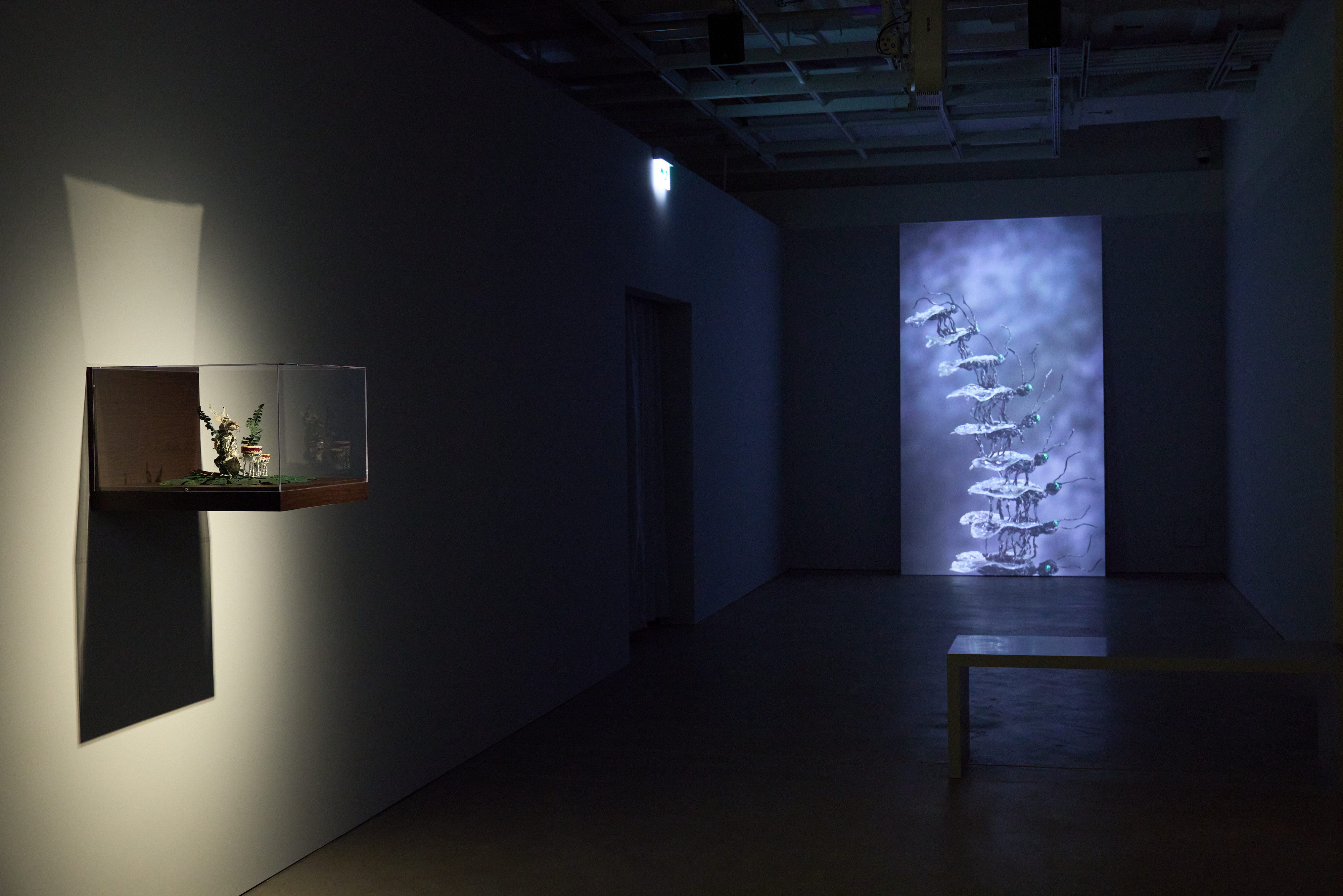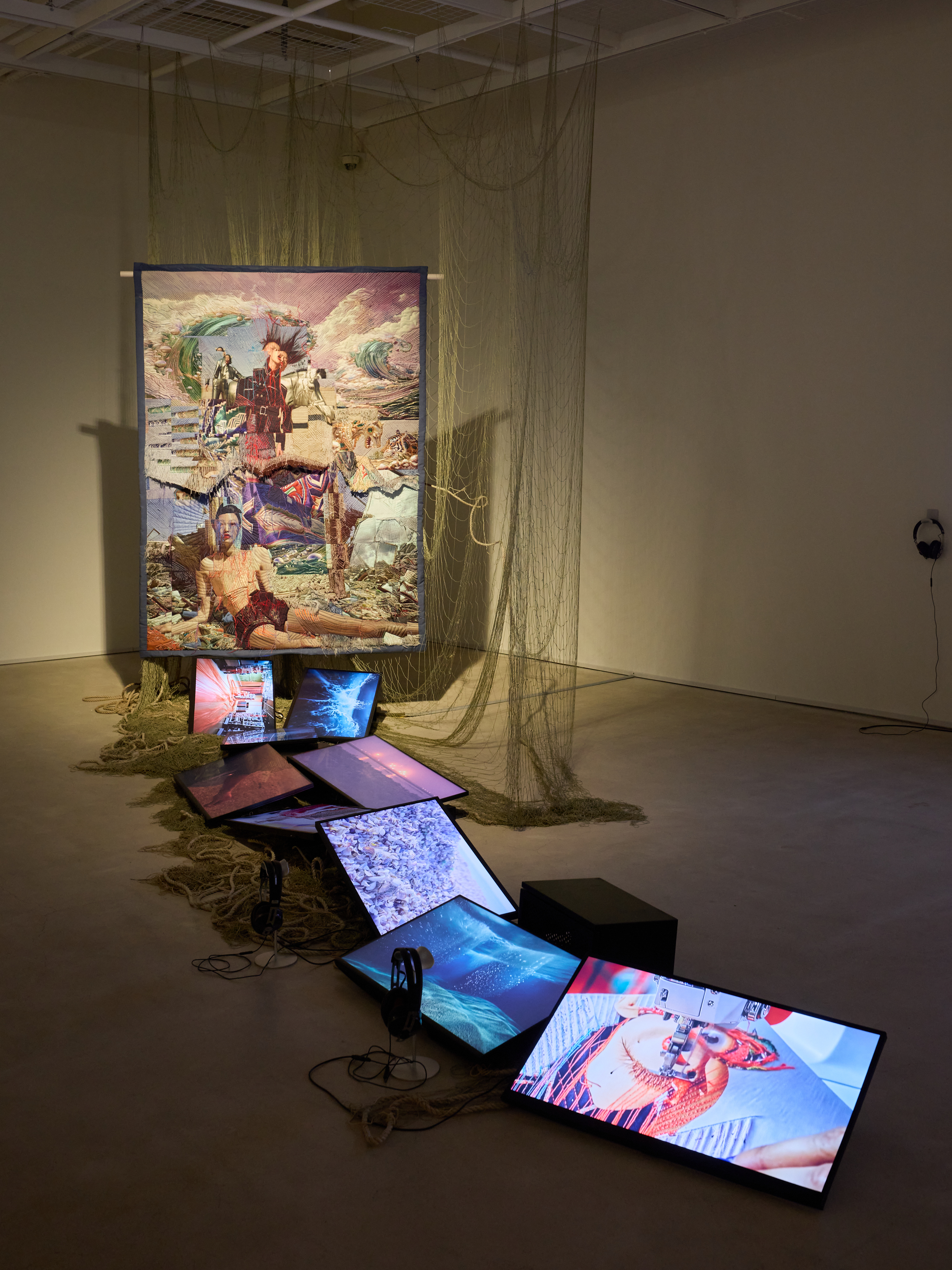 人與自然的割裂關係,或能訴諸科技,尋找出路。哈薩克斯坦藝術家阿瑪古兒.門利巴耶娃展出了三件多媒體裝置藝術,《河中的夢》、《水之母親:Gulbibi Balkhash》、《裏海9》包括三件影像作品及兩件織物,指向的是中亞日益嚴峻的水資源困境,其中鹹海因烏茲別克境內的棉花種植而急速乾涸,而巴爾喀什湖(Lake Balkhash)和裏海(