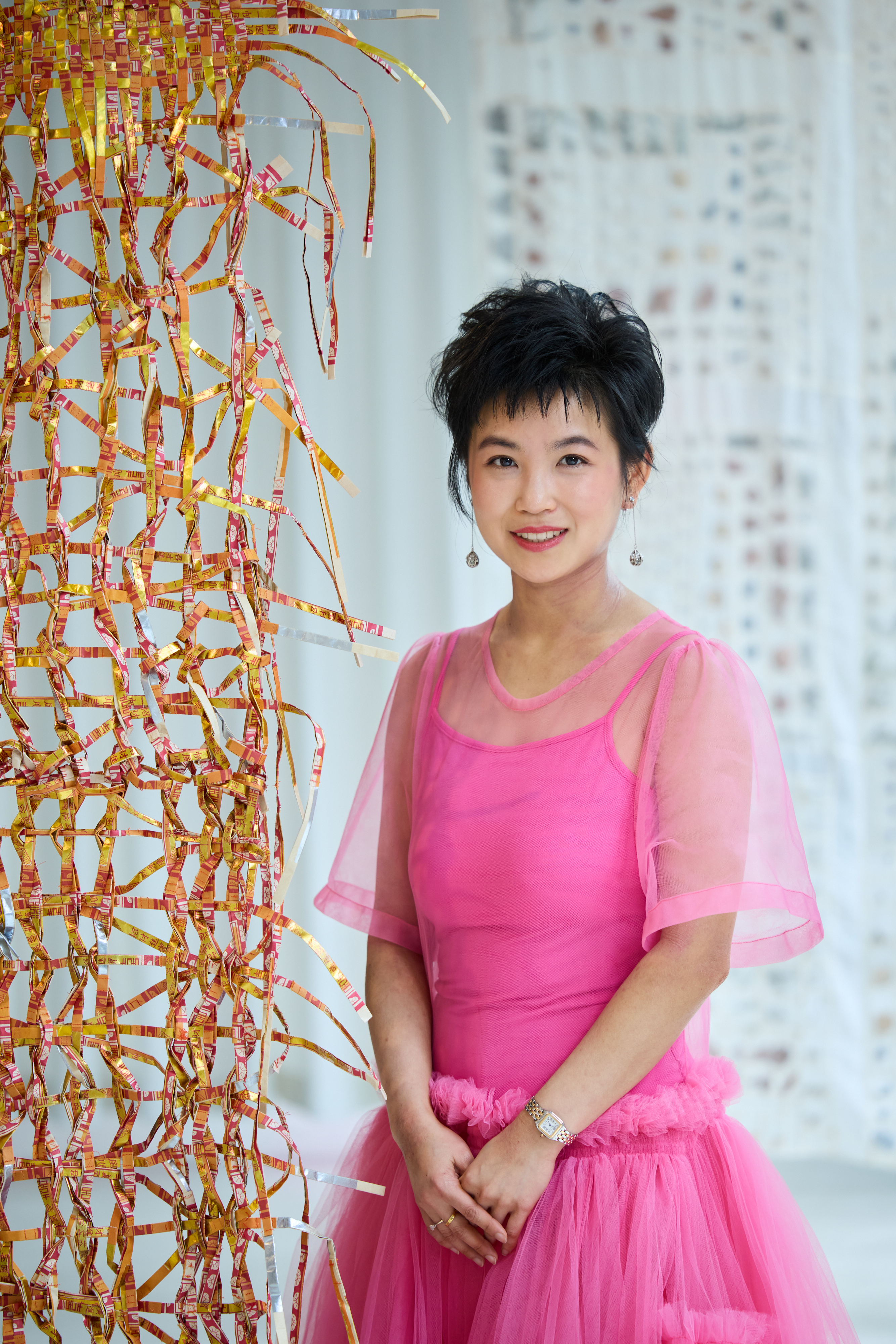 創作者在《陰間陽間只隔了一層紙》這件作品中利用金銀紙,這種材料在華人民間習俗中常用於祭拜先人或鬼神。她將這種具有象徵意義的短暫材料轉變為大型編織品,重新想象其在社會中的文化意義。她精心摺疊每片紙張,並將其縫合編織,形成一大片自由流動的織物,賦予金銀紙新的意涵與價值,並思考傳統的重要性及未來的發展。