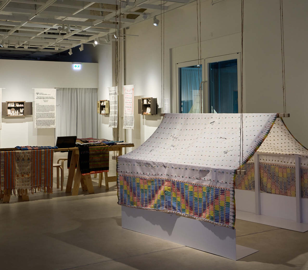 在六廠展出的作品《從這裏到那裏II》延續了上述核心概念,作品以rumah gendang(鼓屋)為原型。鼓屋在曼加萊是村莊的核心,是村民舉辦重要傳統儀式(收穫祭、婚禮、喪禮等)、集會和討論決策的場所,亦是連結祖先、社群關係的重要象徵。在其上縫製自己的名字時,兩名參與者的互動過程,更突顯了我們與他人之間不斷改變的邊界。他們無法看見對方,需要耐心地與對方交流並調整姿勢才能順利進行縫製。這可能涉及到低頭、蹲下或跪地,以傳遞或取回針線,象徵人類互動的動態與協作性。