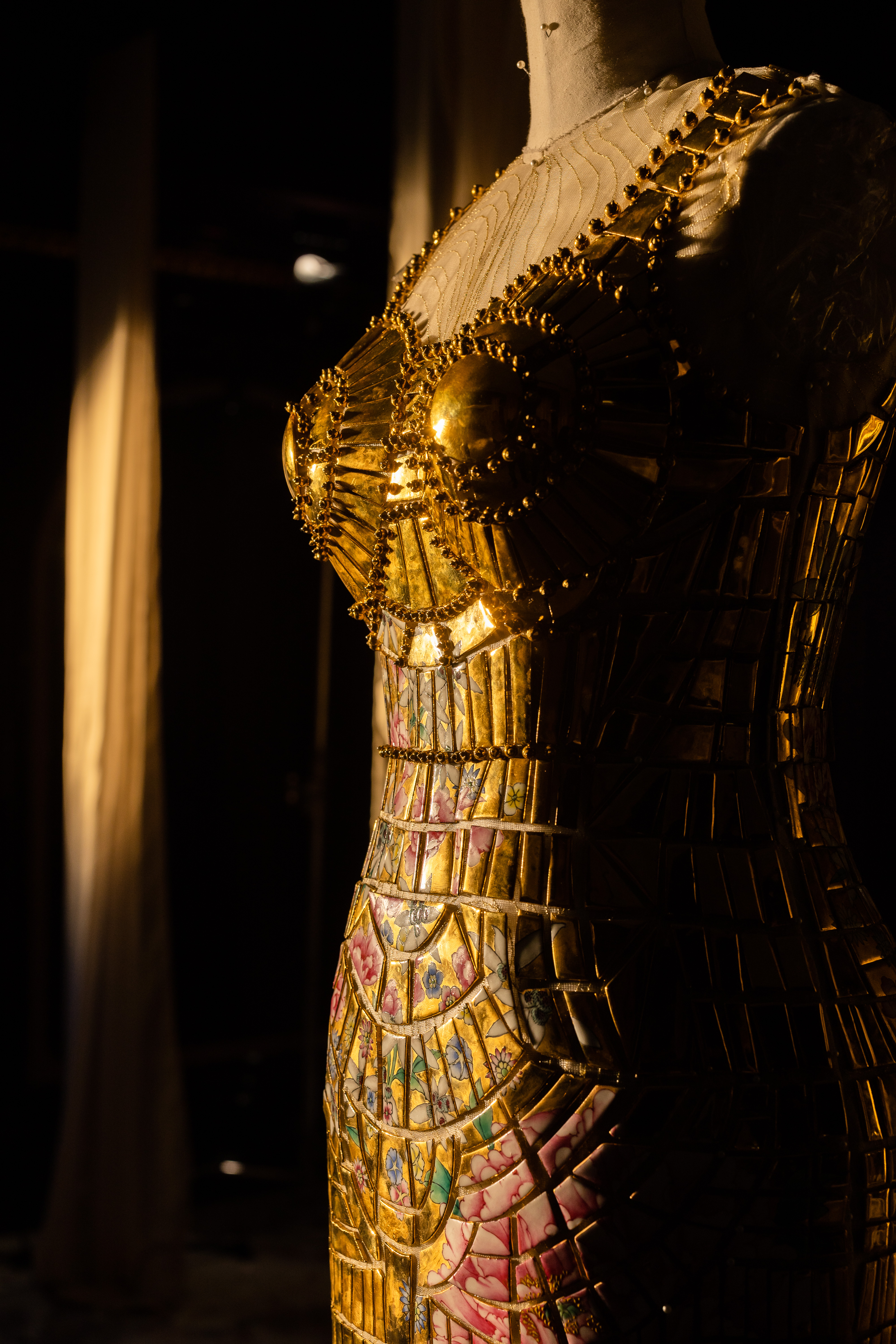 與其說是「合作」,倒不如說是設計界向工藝界拋出的命題挑戰。郭培對禮服的要求是呈現出裙子的曲線之美,她還特地將模特兒人偶的臀部做得豐滿,避免T台模特兒的瘦薄身材。「我想要有大地母親的感覺,這些碎片代表了人類,代表了不同地域的文化,而這條裙子則展現出包容和愛。」郭培說。