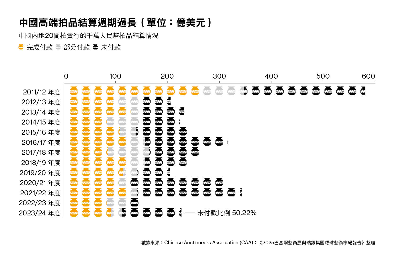 但中國內地的拍賣行比同行面臨多一重挑戰:在高端拍賣作品的銷售中,拍賣行長期受買家延遲付款或「走數」的困擾。《報告》統計中國內地20間拍賣行的數據指出,2023年至24年度,中國千萬人民幣拍品中有五成以上拍品仍未付款,這一現象「加劇了市場的複雜性」。