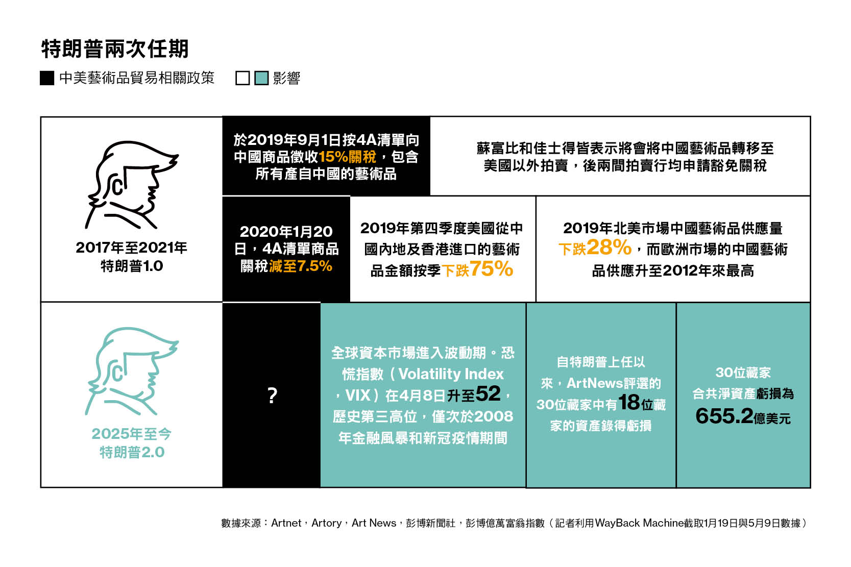 而再次上台的特朗普及其領導下的美國政府,只會令整個行業變得更複雜難料。無論是被他稱之為最美麗詞語之一的「關稅」,還是他變化莫測的執政路線,都將全球各大資本市場帶進了劇烈波動期。不少頂級藏家們的資產淨值大縮水,拍賣品跨境流動和境外購藏都面臨壓力。