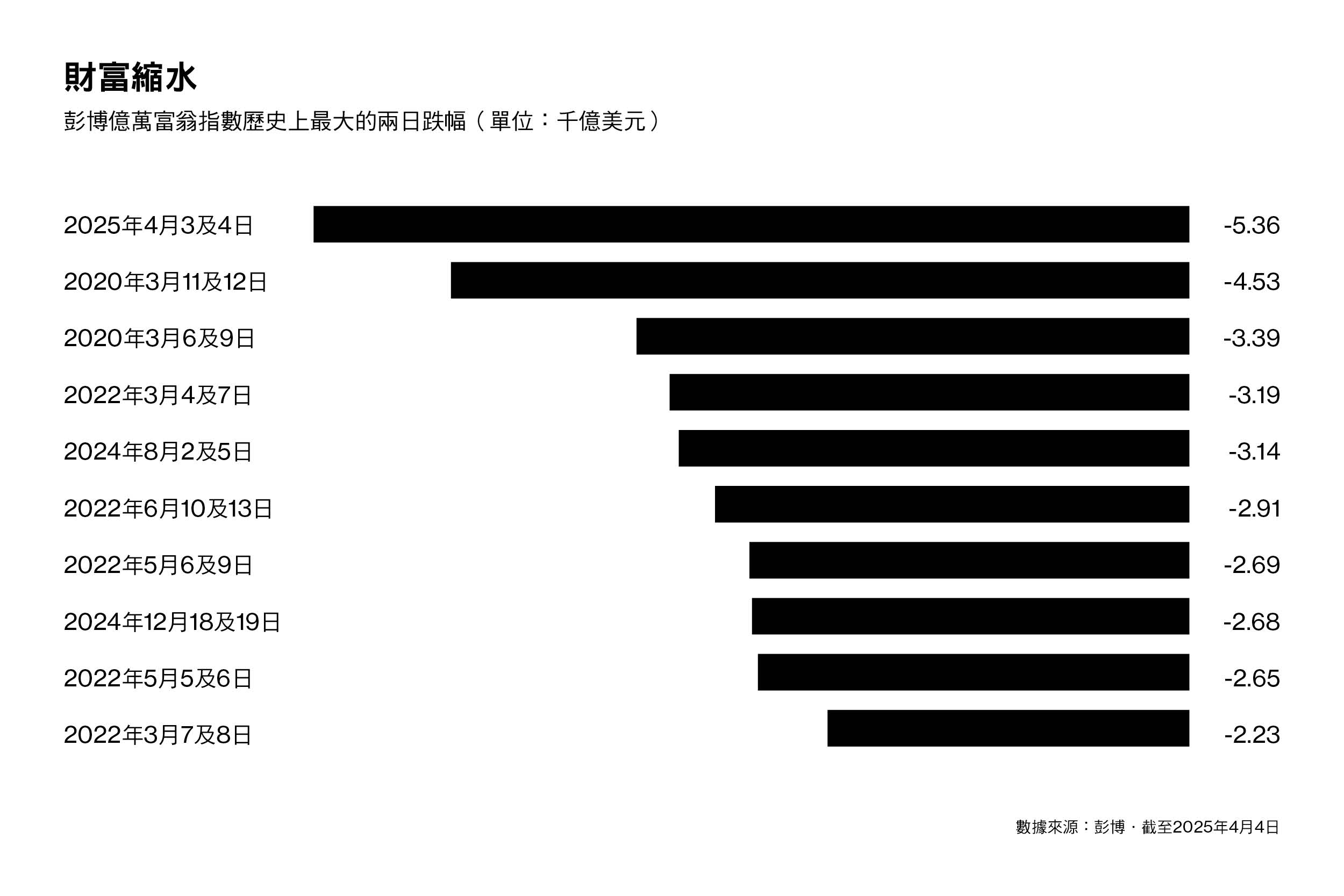 4月2日,開啟總統第二任期不足三個月的特朗普,在他自稱的「解放日」宣布對全球185個貿易夥伴徵收所謂的「對等關稅」。這不僅讓華爾街遭遇重創,歐洲及亞洲股市也應聲下跌,全球股市在此後的三個工作日內蒸發了10萬億美元。這場風波之中,首當其衝的除了大型公司,便是擁有巨額財富的高淨值人士。彭博億萬富翁指數的數據顯示,特朗普宣布關稅政策後的兩日,全球500大富豪的財富共縮水約5360億美元,創下有史以來最大的兩日跌幅。