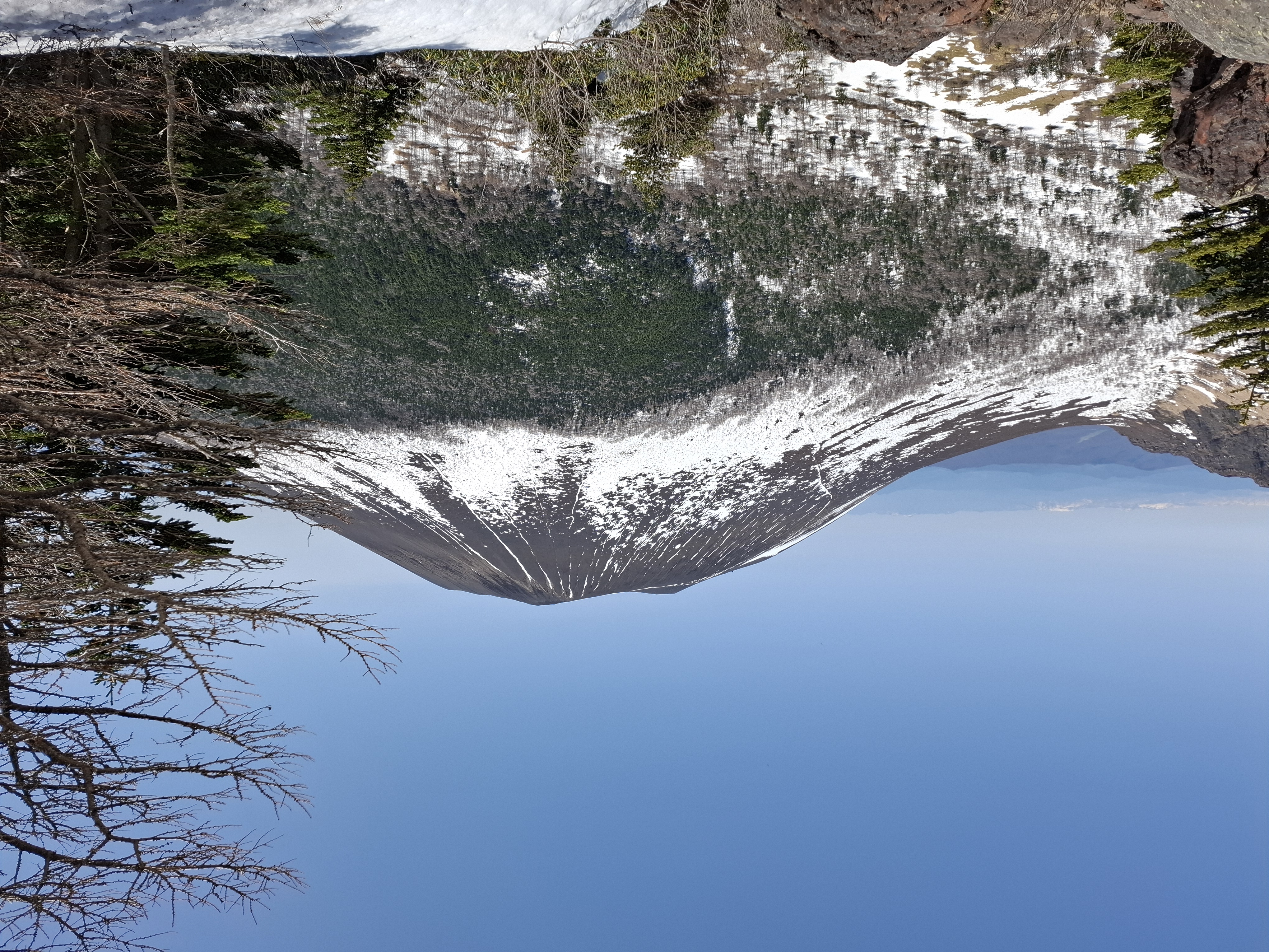 經過了兩個多小時的路程,我們登上山頂,眼睛一下子變得輕盈。東側的淺間山在一片湛藍的映照下,無聲地屹立著──刻有雪痕的黑色山體,積滿了雪的山腰,及其下延綿不斷的針葉林,湧動著原始的生命力。這座年輕的火山在8500年前形成的,名為前掛山和釜山的雙火山口把黑斑山當作地基,拔地而起,形成今天的複式層狀火山──淺間山,在當地一直被視為山嶽信仰的崇拜對象之一。